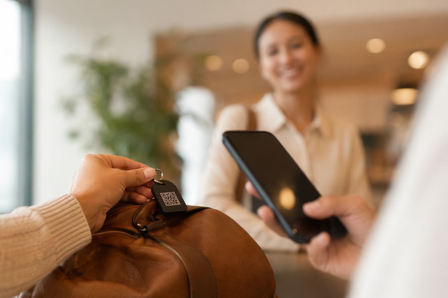 Anyone who finds your bag scans the QR code with their phone — no app needed — and can send you a message immediately, even tell you exactly where the bag is sitting. You get a notification and can respond. The bag never has to enter the lost-and-found system at all. No waiting. No daily phone calls. No 30-day hold.